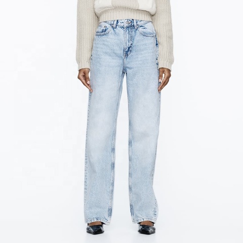 Jeans de mujer de tiro alto azul claro Jeans de mujer de corte recto de longitud larga